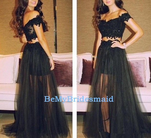Cute Tulle Two Piece Black Prom Dresses 2017, Two Piece Prom Dresses, Prom Gowns