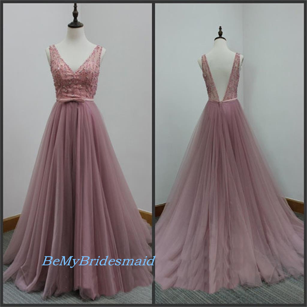 Lovely Handmade Tulle Long V-neckline Beaded Backless Prom Dresses, Long Prom Dresses, Tulle Evening Gowns