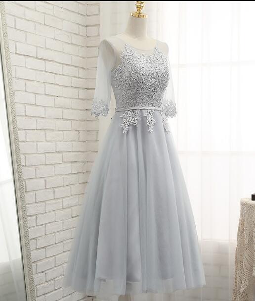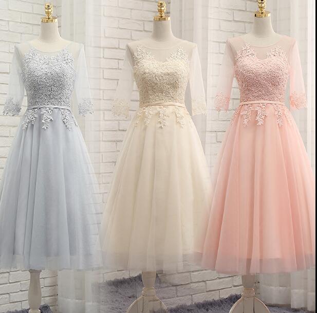Cute Tea Length Tulle and Lace Applique Party Dresses, Short Sleeve Prom Dresses, Prom Dress 2017