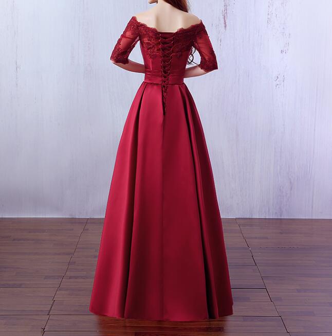 Short Sleeves Off Shoulder Satin Long Prom Dress, Burgundy Prom Dresses, Party Gowns