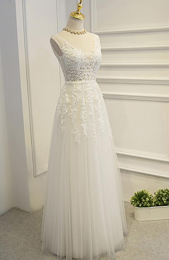 White Tulle and Lace Applique Prom Dress 2018, V-neckline Floor Length Party Gowns, White Formal Dress