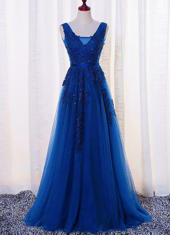 Blue Long Lace Applique V-neckline Party Dress, Blue Prom Dress