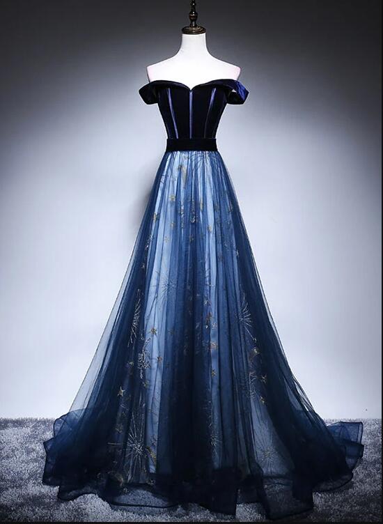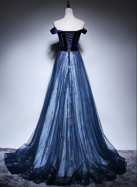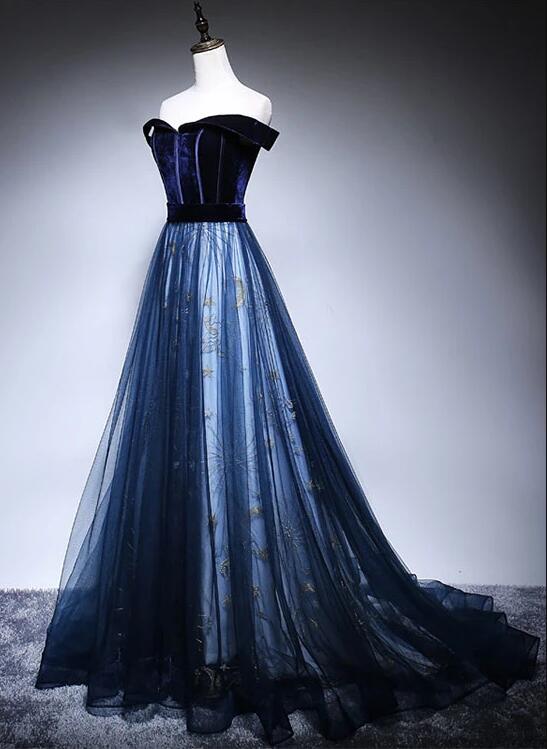 Lovely Blue Tulle and Velvet Long Party Dress, New Prom Dress