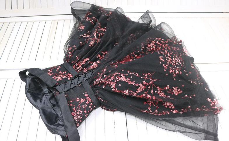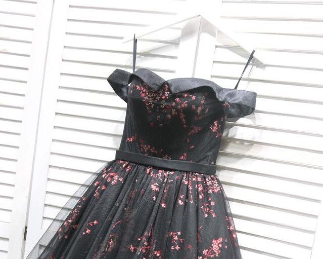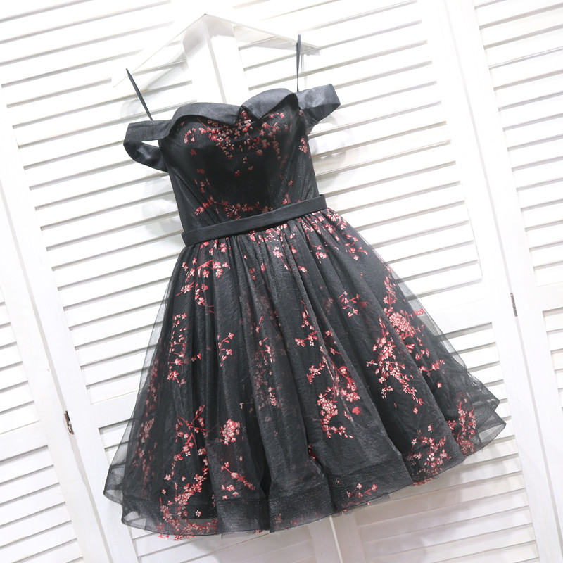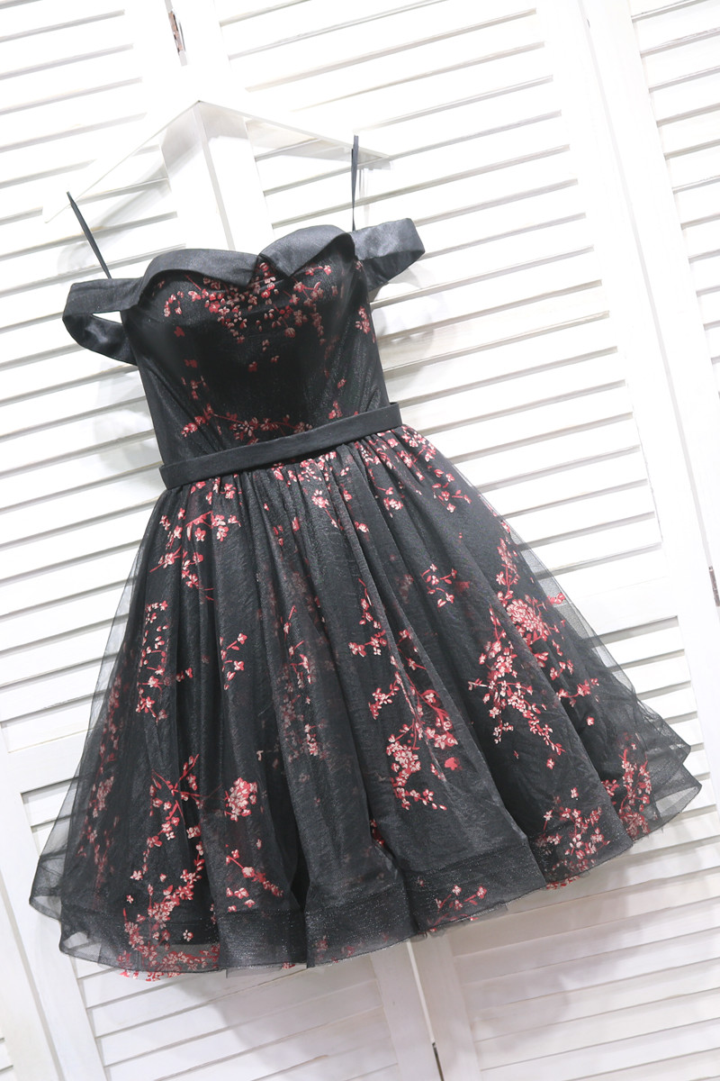 Black Floral Tulle Party Dress, Short Off Shoulder Homecoming Dress 2020