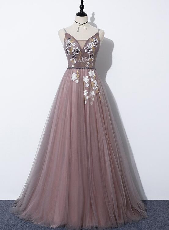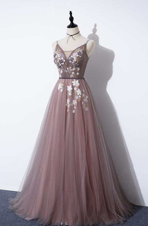 Lovely Pink Straps Tulle V-neckline Prom Dress, Party Gown