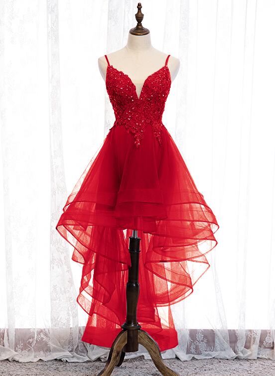 Lovely Red Tulle High Low V-neckline Party Dress, Red Prom Dress