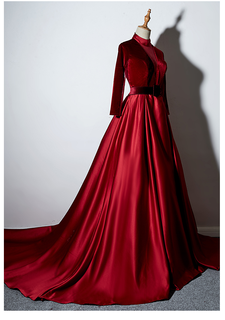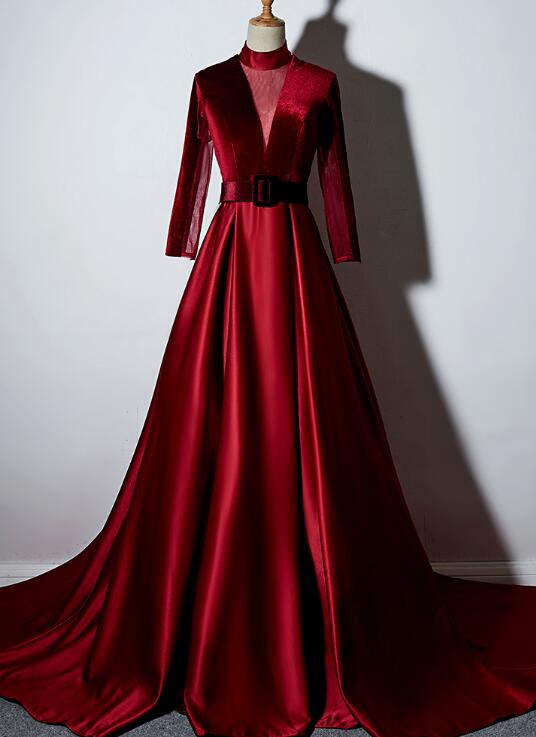 Lovely Red Satin Long Sleeves Formal Dress, Wine Red Prom Dress