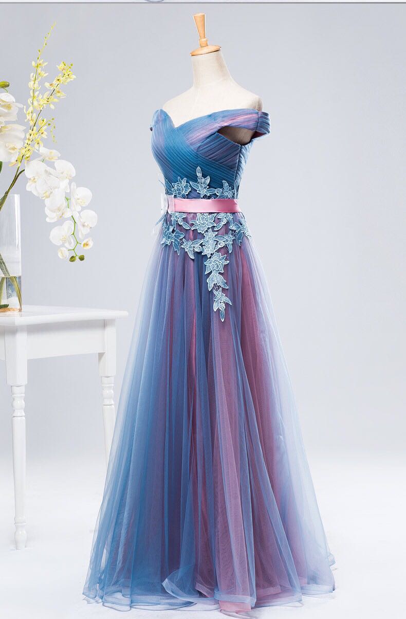 Charming Tulle Long A-line Blue Formal Dress, Bridesmaid Dress